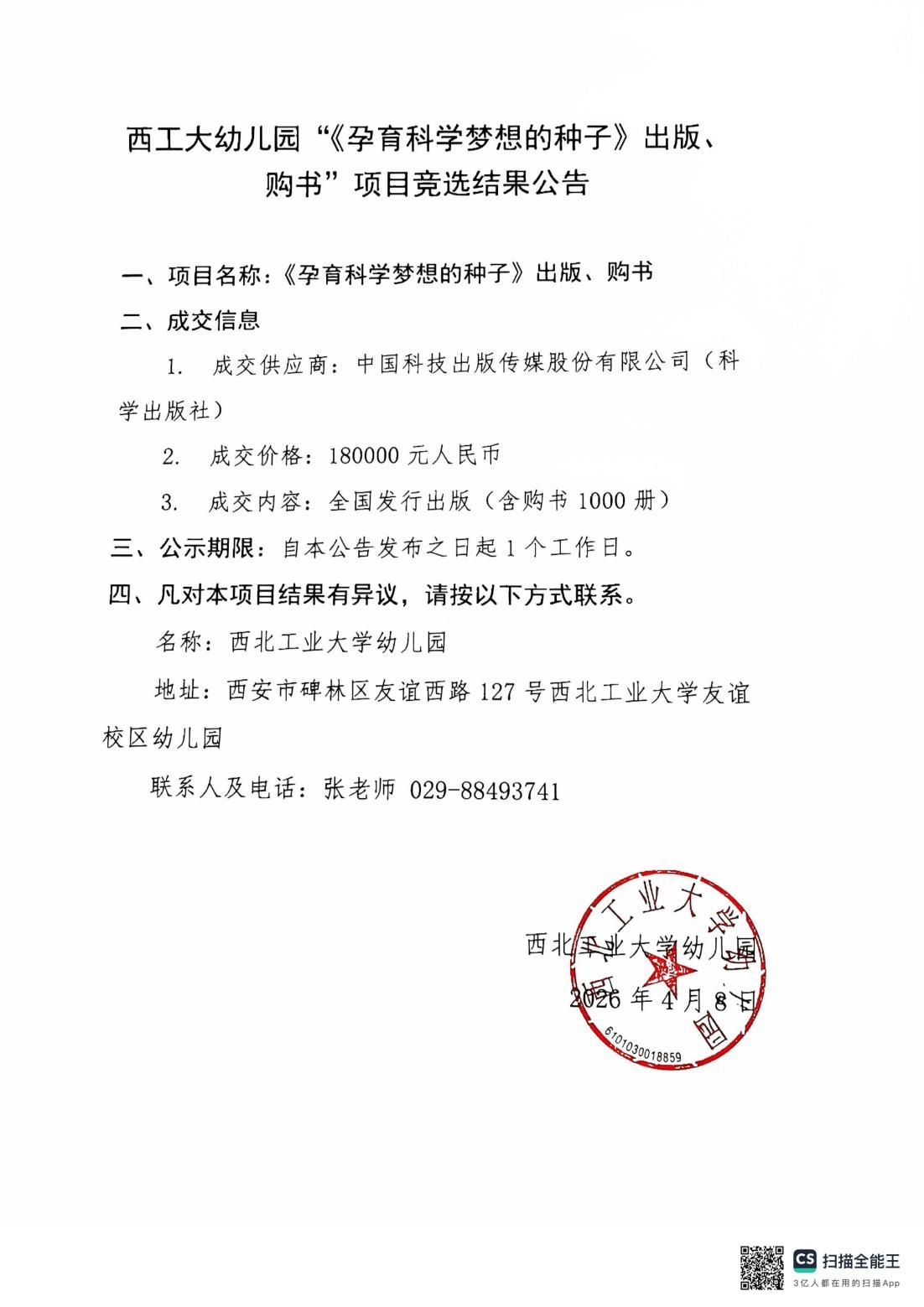 西工大幼儿园“《孕育科学梦想的种子》出版、购书”项目竞选结果公告